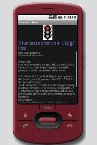 Al termine del calcolo,in relazione al tasso alcolico teorico, il programma riporta una panoramica delle sensazioni ed abilità compromesse nonchè delle sanzioni attualmente previste in Italia.