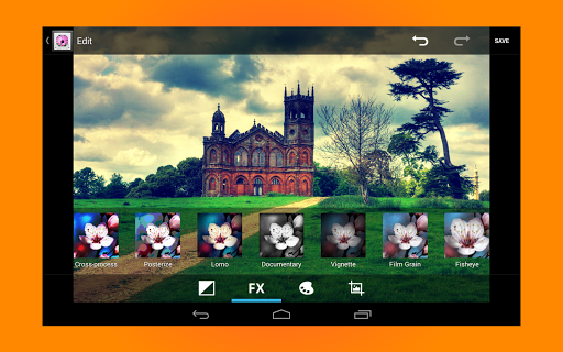 - Live FX photos (Cross-process, Posterize, Lomo, Documentary, Vignette,Film Grain, Fisheye)
