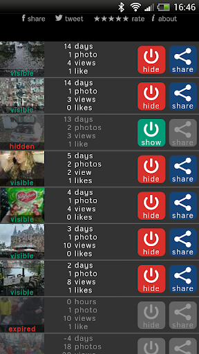 Once you have shared the photo's you can track the number of views and likes. The views and likes are updated when you start the app (and you are online) or by pulling down the list of shared photo's.