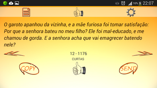 Você pode adicionar piadas para os seus favoritos, enviar um SMS, para postar no facebook.