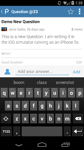 Piazza is the leading social learning platform in education, used by tens of thousands of instructors to efficiently answer students' questions. Piazza engages students and promotes answering classmates' questions in a private, secure, centralized location. Students love Piazza because they get faster answers to their questions. Instructors love Piazza because it saves them time, while giving deeper insights.