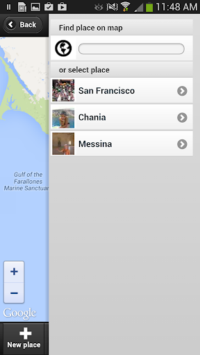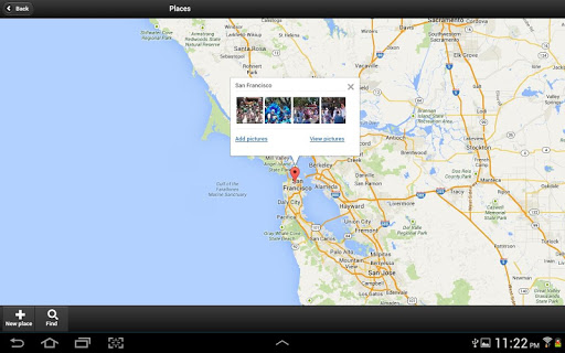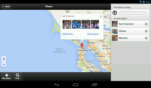 Browse or find pictures on map. Add your own places or create albums based on picture places.