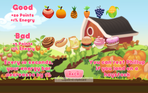 You will start with 5% energy; have Phillup eat as much healthy food as possible to keep up his energy level .