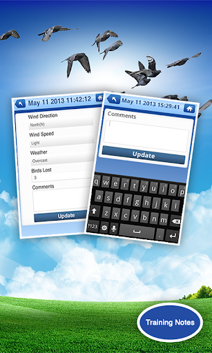 You can then enter the training notes (can be done any time once you have started a new training session). When you select training notes you have various drop-down menus where you can enter the following information - WIND DIRECTION (North, North West, North East, South, South West, South East, West, East). WIND SPEED (Light, Medium, Strong). WEATHER (Overcast, Fine, Raining, Fog, Storm). BIRDS LOST (Manually input number) and COMMENTS (Manually input any comments you want recorded). Once you have done that the notes are saved and you can review them at anytime.