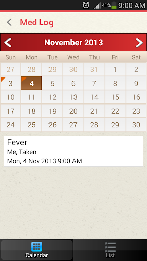 6. Medical Log Record : Details of medicine taken : List view and Calendar view