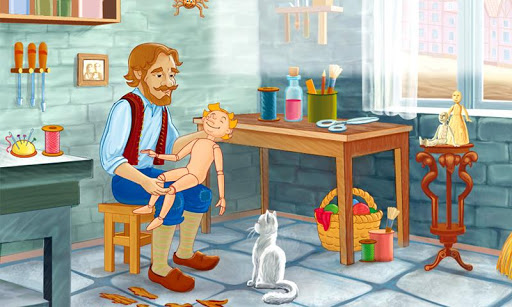 --> Kids help Geppetto carve a block of wood into a wooden puppet-interactive activity