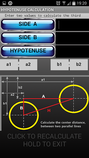 HYPOTENUSE: An aid to calculate the distance between centers of two parallel lines. Taking as reference walls, ceilings, etc...The result can be called within 45 DEGREES PIPES app.