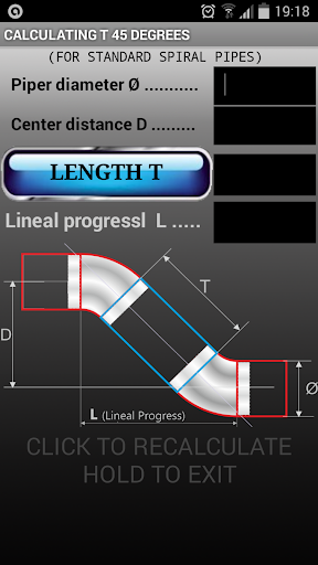 45 DEGREES PIPES: Calculates the pipe length to 45 degrees, between two parallel lines, knowing the diameter and the distance between centers.