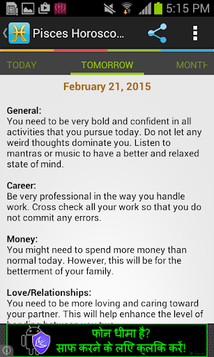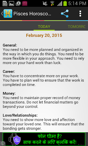 Dear Pisces natives, plan your day as per the planetary influence. Pisceans are usually emotional, sensitive, trust worthy, enthusiastic and are compassionate in relationships. They are very romantic and extremely caring towards their partner. Their patience and understanding skills helps them to overcome any strain or stress. They are generally stubborn and have an interest in spirituality. This application will help you plan your things well in ahead.
