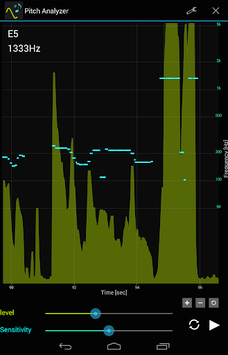 Display area of a volume graph and pitch detection sensitivity is adjustable using the bars