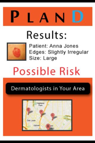 Plan D is an innovative smartphone app that will allow users to take a picture of a mole or lesion with their phone’s camera, and quickly get a professional evaluation of the risk that the area is cancerous. If the area appears cancerous, we recommend a list of nearby dermatologists.