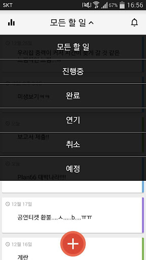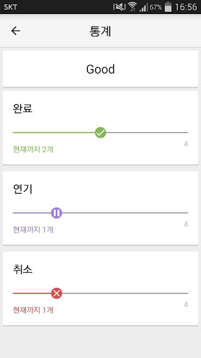 - 진행중/완료/연기/취소/예정 등 5단계의 상태로 할일을 관리합니다.