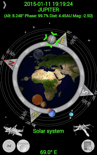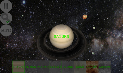 Hit the 3D Planet icon for a detailed 3D view of planet/moon texture and check out the real time positions of the moons of Jupiter and Saturn.