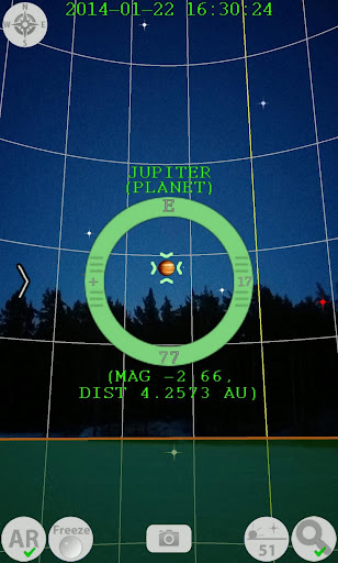 Extremely easy! Just launch the application to obtain an instant overview of the planets surrounding you. You're in the middle of the screen, on Earth, and the planets are being displayed around you. If a planet is above the Compass Ring and is highlighted, it's visible. If the planet is below the Compass Ring, towards the center of the Earth, it is shadowed and below your horizon. The same applies to all the other celestial types. Activate your starcraft engines and quickly travel around in the universe.