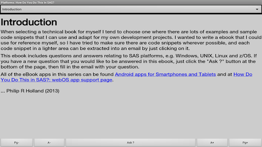 This app, "Platforms: How Do You Do This in SAS?", is one of a series of eBooks about SAS software programming focusing on frequently asked questions and answers about SAS on Windows, UNIX, Linux and z/OS, illustrated by code samples which can be sent by email directly from the app. It is designed to encourage users to contribute questions some of which will be included in future versions of the app. There are controls to select specific questions, move to the previous or next question, decrease or increase the font to suit the user's preference, and send emails requesting answers to questions not yet included in that version of the eBook.