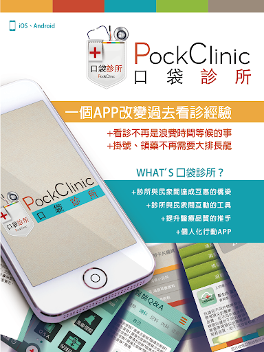 「PockClinic口袋診所」為民眾與診所搭建一座互動的橋,強化診所民眾之間的服務關係。從民眾的角度,改善過去久候的看診經驗,以及單向的資訊管道。藉由PockClinic,您可快速管理個人醫療資訊,包括在地診所資訊、線上掛號、醫療保健資訊、用藥提醒、醫師QA、叫號通知…等多元服務。
