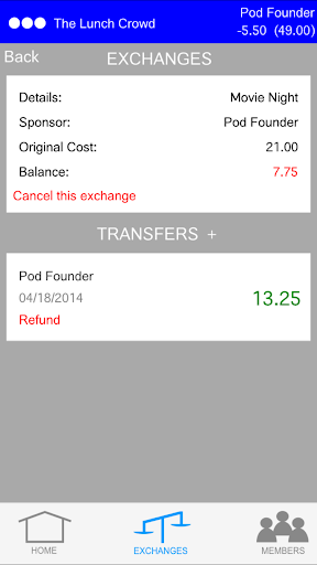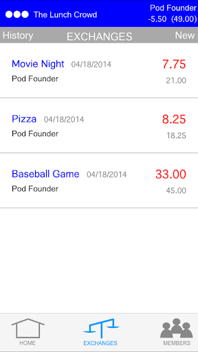 As an example, roommates can use PodPay to create a Pod for the household. When a bill comes in, one of the members pays it, then adds that expense to the Pod as a new Exchange. The Exchange represents a debit incurred by one of the members. and translates to positive virtual currency that can then be spent within the Pod for future expenses incurred by other members.