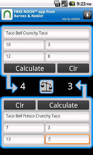 PointCompare allows you to enter information for two different foods and easily see which one is the better choice based off of the WeightWatchers® PointsPlus® value. PointCompare will save entered information so that it can be used again when comparing with another food. This simple app will make it easier to determine which loaf of bread to get, or which entree to choose at your favorite restaurant.