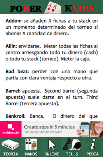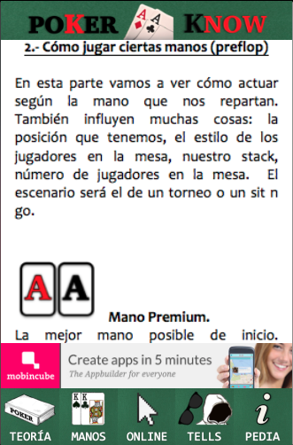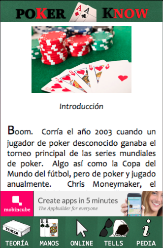 Poker Know es una app de rico contenido sobre el mundo del poker, en concreto de NL Hold'em. Aprenderás nociones básicas e intermedias para saber jugar correctamente.