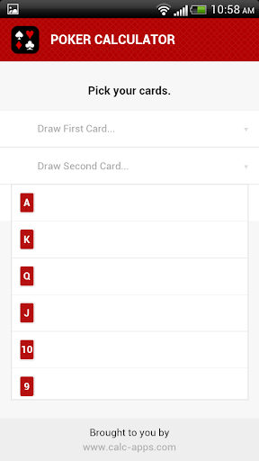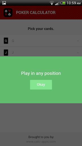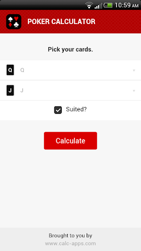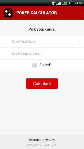 Poker Calculator is a simple Texas Hold'em Poker Odds Calculator that tells you how to play the hand you are dealt. By referencing statistical analysis of over 1 million hands of poker, this app provides a simple set of instructions about when to play.