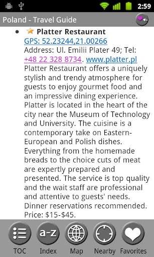 MobileReference Travel Guides provide detailed, practical information about attractions, landmarks, transportation, cultural venues, dining, lodging, history and much more. They are indexed alphabetically and by category, making it easier to access individual articles. Attractions can be viewed on an offline GPS map along with your current location so that you can easily find attractions near you as you explore the city.