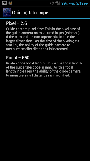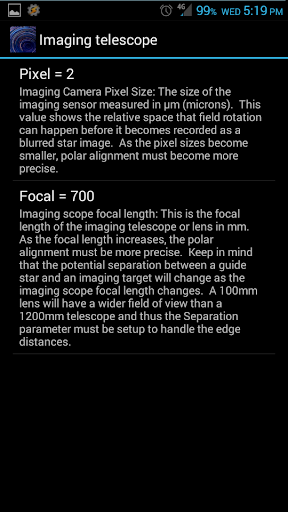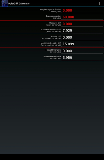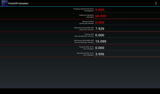 After entering the values in the Imaging setup parameters menu, then entering the values of Declination and Exposure Duration on the main screen, the maximum allowable error is displayed. During drift alignment, the speed star movement should be recorded and entered as Measured Drift to determine current conditions.