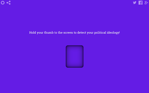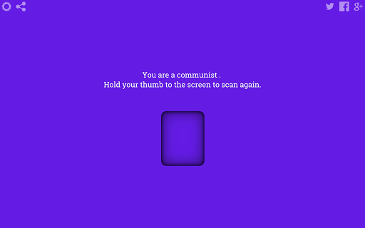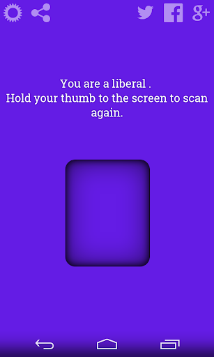 Political Detector is a fun novelty app that tries to determine your political ideology by doing a mock thumb print scan! Simply place your thumb on the scanner and when the "scan" completes, the app will try to guess what your political ideology is. A fun app for friends, parties, or impressing the girls at the club. Note that this is a novelty app only, the thumb print scan is not real, and the app can not really tell what your political ideology is.