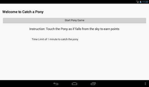 This game is for infants to toddlers. Touch the screen to catch the pony falling from the sky and earns points. There is a limited 1 minute to earn a maximum points. Have Fun.