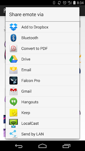 Share emotes with friends with the sharing function! Simply tap and hold an emote to share in Hangouts, email, bluetooth, whatever strikes your fancy!