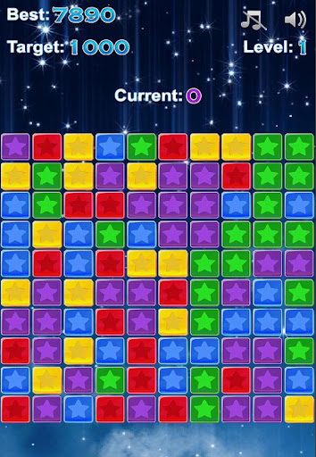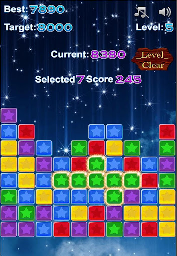 这是流行的游戏 “PopStar” 的2015年的版本。点击两个或两个以上相同颜色的星星消灭他们。