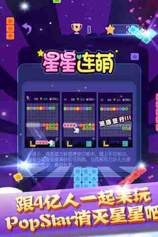 《PopStar!消灭星星官方正版》是最经典的消除类休闲手游,全球拥有超过4亿用户,始终是休闲游戏的领导者,被誉为“全球最好玩的小游戏”!游戏画面清新,玩法简单易上手,只要点击相邻的同色星星即可消除得分,没有关卡限制,是轻松益智的首选小游戏。游戏设定丰富的每日登陆奖励、每日任务和等级挑战等趣味内容,惊喜重重好礼多多,是手机必备的时间杀手小游戏,一旦开始根本停不下来!新模式“星星连萌”强势登陆,”消灭星星“与”俄罗斯方块“的完美结合,诞生创意与经典的纯真快乐!新玩法简单更有趣,只要将各种形状的星星填满一行或一列即可完成消除。你只需要下载一个游戏,