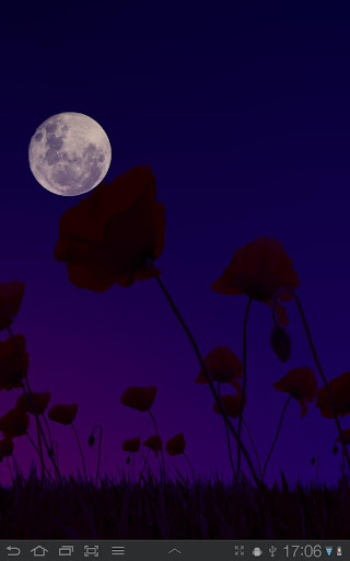 A field with red poppies swaying in the wind while clouds move over the sky that shifts color dynamically during the day and night. At dawn the sun rises and moves slowly over the sky until sunset around 6 pm. Or set the sunrise and sunset times to any time you like. As the night falls the moon appears clearer and clearer until fully visible at midnight.