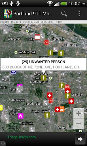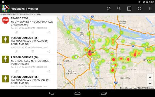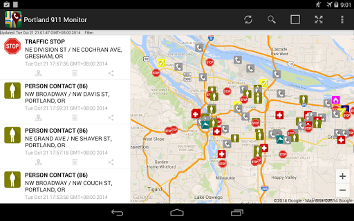 Users can monitor the City of Portland, Oregon's Police 911 Dispatch Incidents using this app. The 100 most recent, closed, non-confidential calls for service received by the City of Portland's 911 system can be viewed as a text list, on a map as icons or heat map. Examples of incidents include burglary, accident, fire, assault, drugs, death, and many more. Incident details can be viewed by touching an item on the list or a marker on the map display. A function is available to easily filter away unwanted incidents from the list or map by text. The app allows the user to send the incident location to Google Maps and/or Street View for better visualization of the 911 incident environment.
