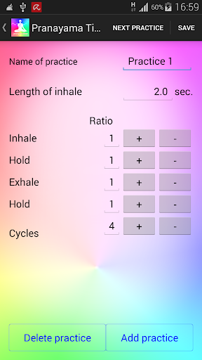 Your intelligent assistant for effective breath practice. It allows to create a sequence of several practices. You can modify a ratio of an inhalation/hold/exhalation lengths and also a quantity of cycles.