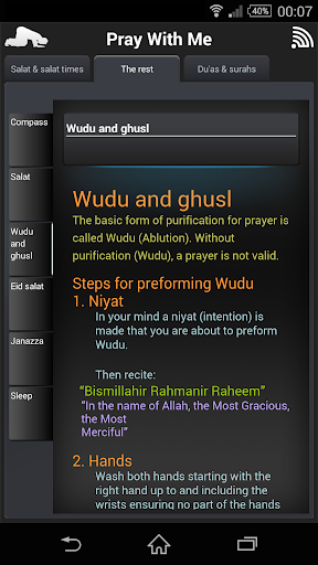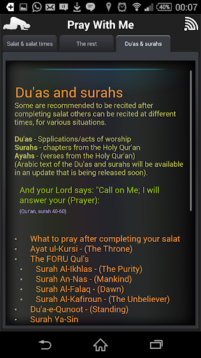 This great app provides you with all the tools to aid, help and assist you to enjoy and to perfect your salat (5 daily obligatory prayers) and also aims help you increase the collection of surahs (verses) to call upon and recite while performing salat.