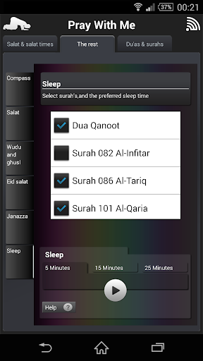 * OVER 40 SURAHS AND DU'AS TO CHOOSE FROM. Select a rakat, and choose the surah to listen to and recite after surah Fatiha - either while performing salat or while using the sleep function.