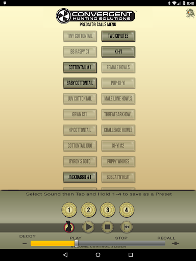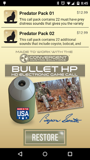 Convergent Hunting’s Predator Pro is designed to work in conjunction with the “Bullet HP” (special purpose Bluetooth controlled speaker/decoy). Together, the Convergent Hunting apps and Convergent Bullet HP, combine the latest in technology to provide you with a complete calling platform that is unique, versatile, all wrapped-up in a high performance package. All sounds packaged in Convergent Hunting’s Mobile Calling Apps have been recorded in High Definition and are digitally mastered to provide you with sounds that will elicit responses from even the most wary animals.