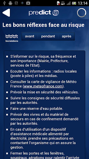 Predict est une application destinée aux gestionnaires des risques pour les aider dans leur mission de sauvegarde face aux risques hydrométéorologiques. Elle permet aux abonnés des services de Predict d’être informés par anticipation en cas de risque d’inondation, de tempête, de submersion marine ou de forte chute de neige menaçant leur territoire. Ils peuvent y visualiser les précipitations en cours, les informations sur les risques induits, consulter leur plan d’action face à ces risques et partager leurs observations de terrain par l’envoi de photos commentées et géolocalisées sur la situation.