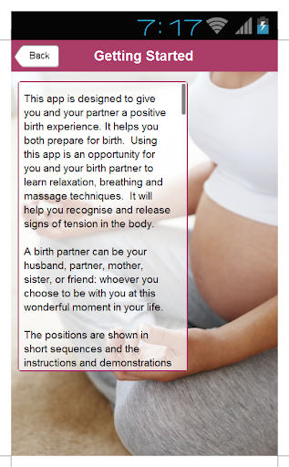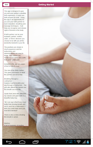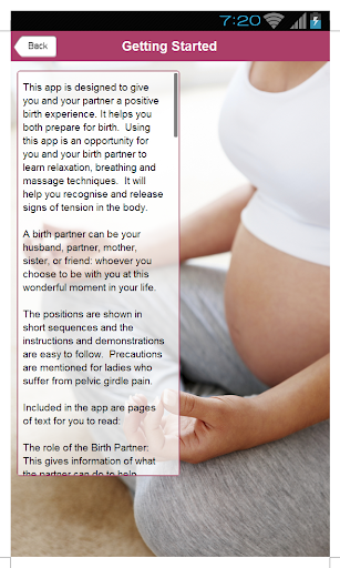 In this Preparing for Birth App are pages of text: They include information on how the birth partner can help you at this special time, how to breathe through a contraction, relaxation, and other useful advice for when you are on your journey to meet your baby.