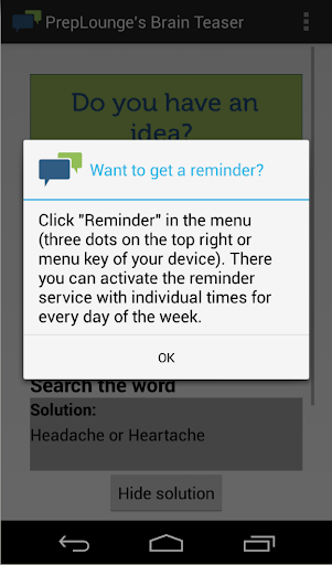This app shows the daily brain teaser by PrepLounge. By using the reminder service you can receive a notification every day. The time can be set individually for every day of the week.
