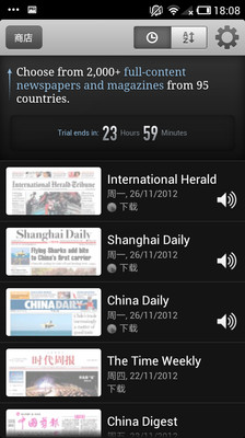 如果你喜欢阅读国外报纸,杂志,却又苦于无处购买,那么这款软件肯定适合你。软件分为3个功能,My Library、Store、Setting,分别是已下载、内容商店、设置。只需要点击媒体名字即可下载PDF版本的报刊,软件会智能排版,用户可以在原版和精简版之间切换浏览。免费版只能下载7份报纸。