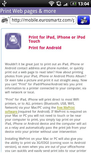 "Print" enables you to quickly and easily print out photos, contacts, & phone numbers - or print out web pages to read later. You can also print from other apps like Gallery, or Internet Browser apps and even Email using the "Share" command. With Print you can print to ALL printers. Print direct to most Wireless printers without additional software. Print to ALL printers via your Mac/PC. Print remotely over 3G and in corporate networks or when Wifi is not available.