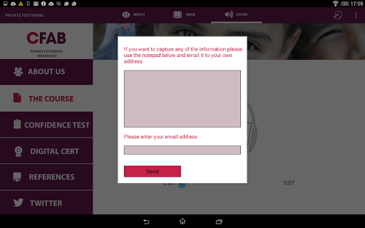 The app provides you with a Digital Certificate which is awarded upon successful completion of a 'Confidence Test'. The course is also accompanied by an About Us, Reference and Twitter section.