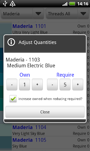 Maintain and view your own stock levels as well as adding threads to shopping lists which can be shared.