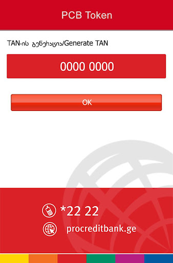 ProCredit Bank Mobile Token generates a one-time TAN (transaction number) which is used to confirm transfers and other transactions over the Internet and through the mobile banking system. The TAN generated is an alternative to DigiPass and SMS TAN and allows you to confirm as many transactions as you want. Private and business clients using the full Internet Banking package can access this PCB Token generation application from Georgia and abroad without activating roaming.