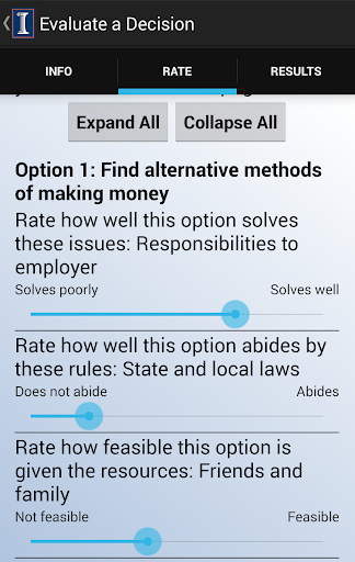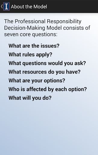 This app helps users gain feedback on ethical decisions based on the Professional Responsibility Decision-Making Model conceived by the Center for Professional Responsibility in Business and Society at the University of Illinois.