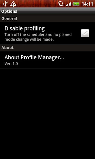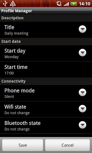 Trying to save your battery life ? Tired of being woken up during your sleep ? Tired to turn vibrate mode on prior to going to class ? Enough to disturb your colleagues at work ? Profile Manager is the tool made for you. It enables you to automatically switch your phone mode (vibrate, ringer, etc.), to turn on the wifi, the bluetooth... Make that your phone understand your needs, not the other way around !