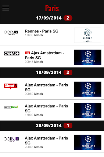 - Par compétition : L1, L2, National, Ligue des champions, Ligue Europa, Serie A, Premier League, Bundesliga, Liga, Liga Sagres, ... ;