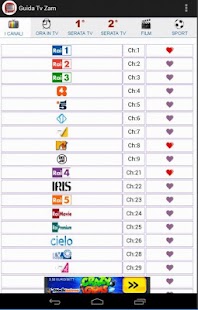 Rai 1, Rai 2, Rai 3, Canale 5 , Italia 1, Rete 4, La7, Mtv, Deejay Tv, Rai 4, Iris, Cielo, Boing, Sportitalia 2, Sportitalia 1, Rai Storia, RaiGulp, Raisport 1, Rai 5, La5, Rai Movie, Mediaset Extra, La7d, Rai premium, Italia 2, Realtime, Dmax, 7 Gold, Odeon, Rai News, Rai YoYo, DeaSuper, K2, Frisbee, Super Tennis, Tv 2000, Arturo, Nuvolari, Cartoonito, Focus, Giallo, Raisport 2, Rai Scuola.