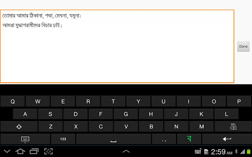 ** In Bangla non-supported devices users can see Bangla including ligatures (যুক্তবর্ণ) while typing. **